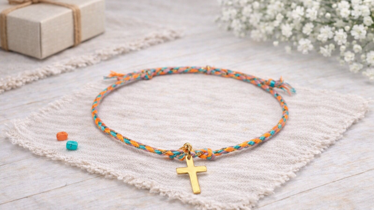 Pulsera cruz dorada, con cordón de colores variados o cordón color liso