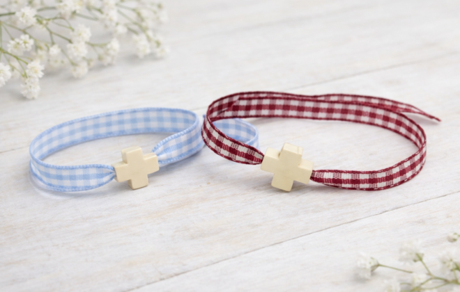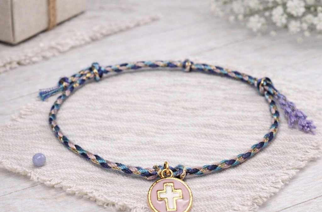 Pulsera cruz redonda calada, con cordón de colores variados.